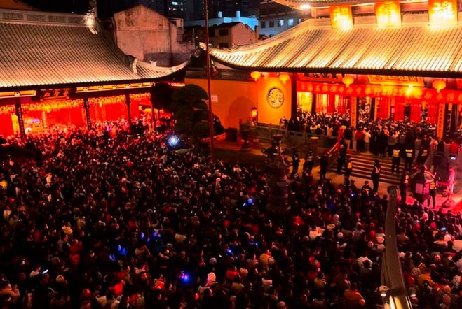 温暖除夕夜 上海玉佛禅寺撞钟迎新暖...